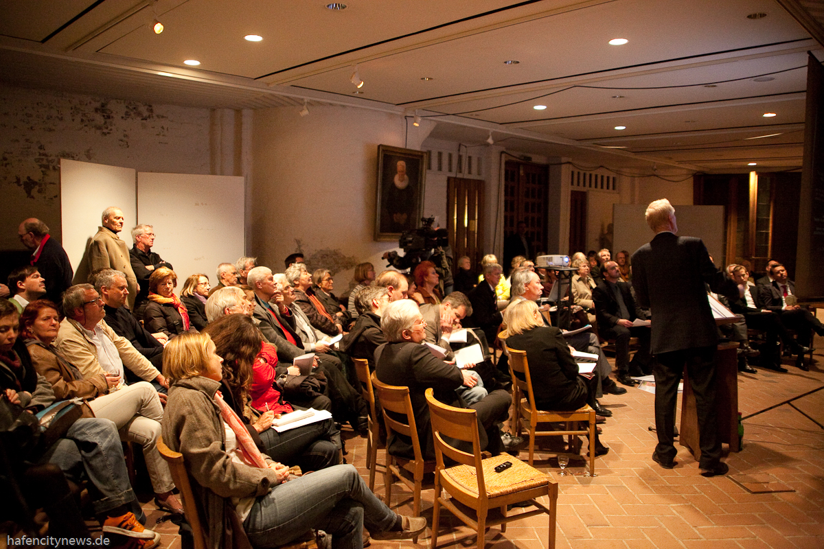 Wird aber dennoch lebhaft als er gefragt wirdAlso eigentlich höchste Zeit dass beide Seiten sich nochmal zusammensetzen, den Tacho auf Null stellen und anfangen Stadtplanung mit der Basis zu machen. Sich auf die Ergebnisse von Wettbewerben zurückzuziehen ist da wenig hilfreich, zumal inzwischen der Eindruck entsteht, dass in den Jurys immer die gleichen „Experten“ sitzen, die endlose Riegel von platten Bürogebäuden produzieren. Anwalt Ackermann aus dem Katharinenquartier hatte schon zu Anfang die Ahnung: „ Das bedeutet natürlich dass die Hochtief draußen wäre – das können die angesichts der Elbphilharmonie aber notfalls verkraften“. Das die Diskussion dennoch auch das Interesse breiterer Kreise erregt konnte man im Publikum sehen. Herbert Schalthoff hat dabei einen guten Job gemacht. Ob es reichen wird beide Parteien nochmal an einen Tisch zu bringen wird sich zeigen.