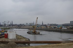 Die HafenCity wächst weiter. Um das östlichste Quartier „Elbbrücken“ bauen zu können, wird seit Mitte April am Ende des Baakenhafens „Land gewonnen.“ Hier spült ein Spezialschiff, ein so genannter Saug- oder Hopperbagger, der an drei Stellen in der Elbe Sand entnimmt, diesen für die teilweise Verfüllung des Hafenbeckens in den Baakenhafen. Auf diese Weise werden pro Tag bis zu 20.000 Kubikmeter Sand bewegt, insgesamt werden 300.000 Kubikmeter Elbsand benötigt, um eine Fläche von 25.000 Quadratmetern aufzuschütten. Würde man dieses Volumen per LKW transportieren, wären das mehr als dreißigtausend Fahrten.