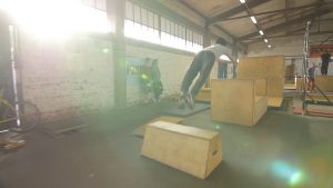 P1120218.MP4.11_45_54_04.Still001Freie Trainingszeiten laden zum Kennenlernen und Austauschen ein, wobei neuen Ideen stets ein Raum geboten wird. In dieser Zeit gibt es nur eine Regel: Jeder darf mitmachen! Im Oberhafenquartier öffnet Die Halle – Parkour Creation vom 2. Mai bis 3. Juli die Tore, bevor es Ende des Jahres endgültig losgeht. CF