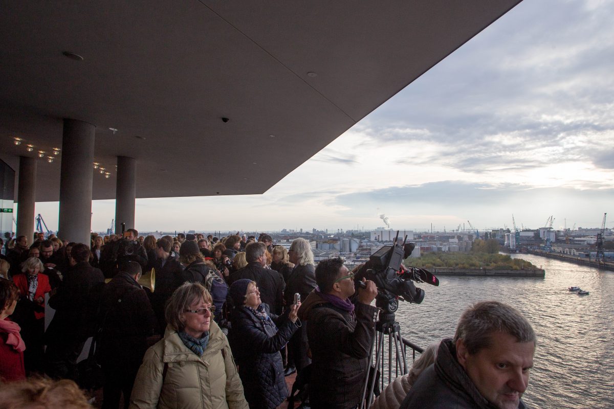 Die Plaza der Elbphilharmonie, die öffentliche Aussichtsplattform zwischen dem ehemaligen Kaispeicher und dem gläsernen Neubau, wurde heute im Rahmen eines Festaktes offiziell eröffnet. An der Zeremonie anlässlich der Plaza-Eröffnung und der Übergabe des Gebäudes durch den Baukonzern Hochtief nahmen Hamburgs Erster Bürgermeister Olaf Scholz, der Vorsitzende des Vorstands der Hochtief AG Marcelino Fernández Verdes, der Generalintendant Christoph Lieben-Seutter sowie die Architekten Jacques Herzog, Pierre de Meuron und Ascan Mergenthaler vom Architekturbüro Herzog & de Meuron teil. Zudem waren rund 200 Hamburger Bürgerinnen und Bürger eingeladen – von Schülern der benachbarten Katharinenschule bis zu ehemaligen Hafenarbeitern, die früher im Kaispeicher A gearbeitet haben, auf dem heute das neue Konzerthaus entstanden ist. Ab 5. November ist die Plaza für jedermann zugänglich.