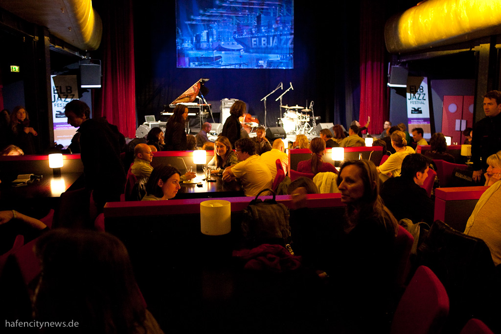 Auch abseits des Festivals einen Besuch wert - das IBA DockAuch Top: der anschließende Rest des Konzertes von Nils Wülker, der vor Manu Katché auf der Hauptbühne spielt. Bei Manu Katché schließlich beginnt der Stundenplan schon wieder eng zu werden. Die Masse an Zuschauern lässt nichts Gutes ahnen, wie es an der Barkassenfront bei Konzertende aussehen wird. Also vor dem Konzertende schon einmal in Richtung Barkassen abgesetzt, gibt einen Vorsprung vor dem Hauptfeld. Auf dem Weg in die Katharinenkirche zum Portico Quartett nur mal kurz einen Blick in das Stage Kehrwieder Theater werfen – so die Idee. In dem Speicher neben dem Miniaturwunderland ist das Programm komplett durcheinander geraten. Das eigentlich für 19:30 angekündigte Studnitzky Trio steht jetzt um kurz vor Mitternacht auf der Bühne – und nimmt mich sofort gefangen. Katharinen adé! Ähnlich geht es anderen Gästen, das plüschige Ambiente wie im Schmidts, die späte Stunde und die bequemen Sitze tun ihr übriges, hier soll es also enden – das Elbjazz-Festival.
